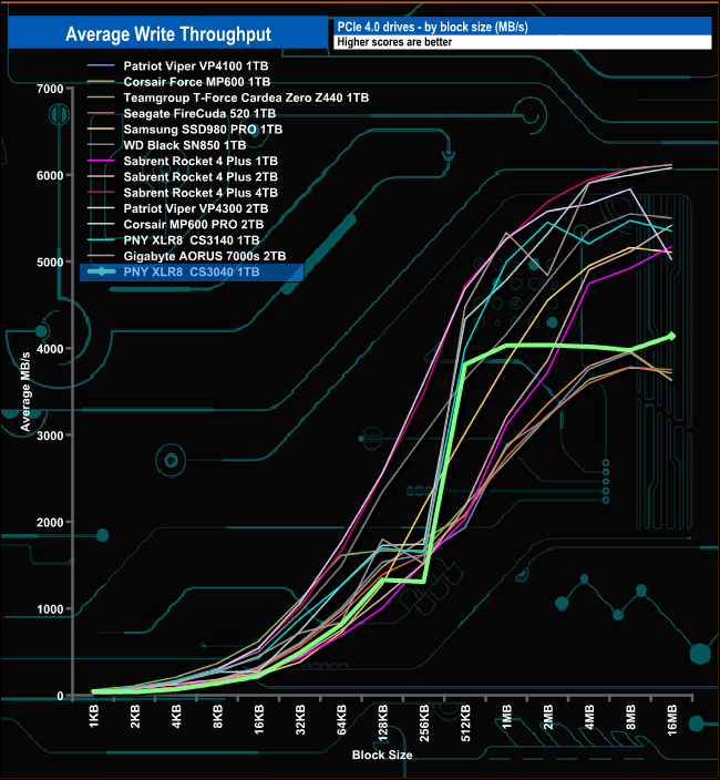 The 4,030MB/s read throughput result puts the XLR8 CS3040 into the bottom half of our result chart.