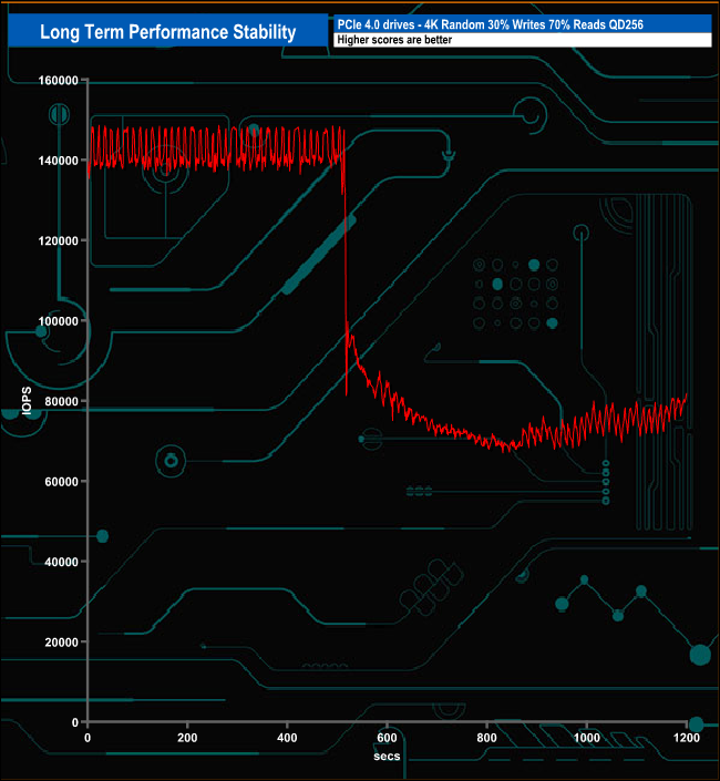 For the long term performance stability test, we set the drive up to run a 20-minute 4K random test with a 30% write, 70% read split, at a Queue Depth of 256 over the entire disk. The 1TB PNY XLR8 CS3040 averaged 104,279 IOPS for the test with a very good 70% performance stability.