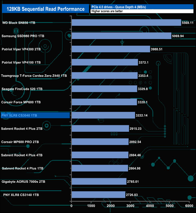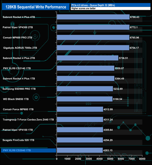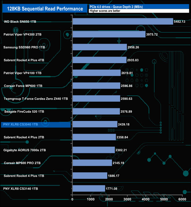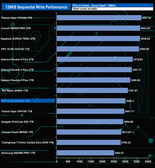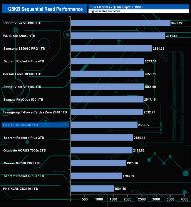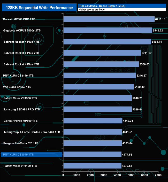 At a QD of 1, the PNY CS3040 sits in the bottom half of the results chart but at QD2 its is in last but one place and at QDs 4 and 32 it sits in last place.