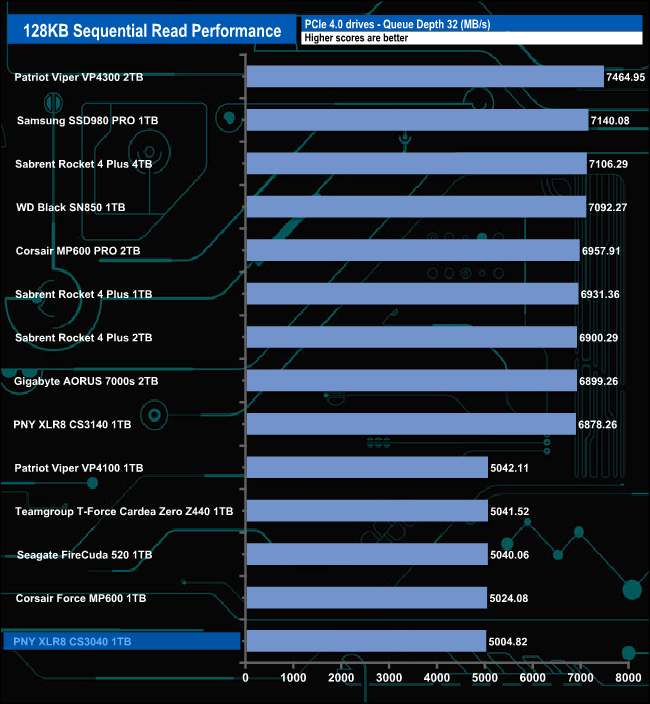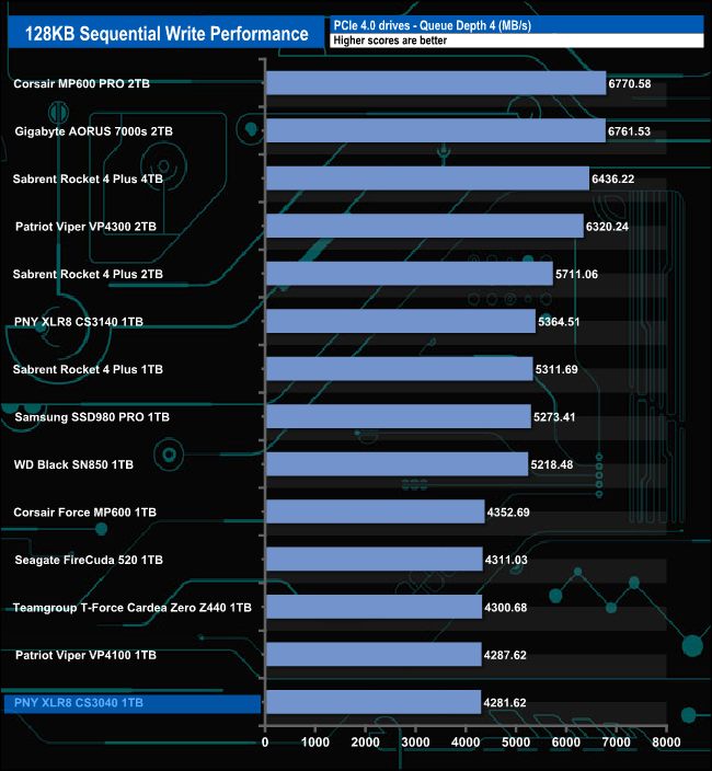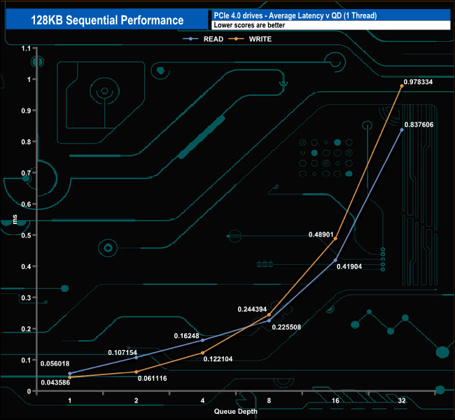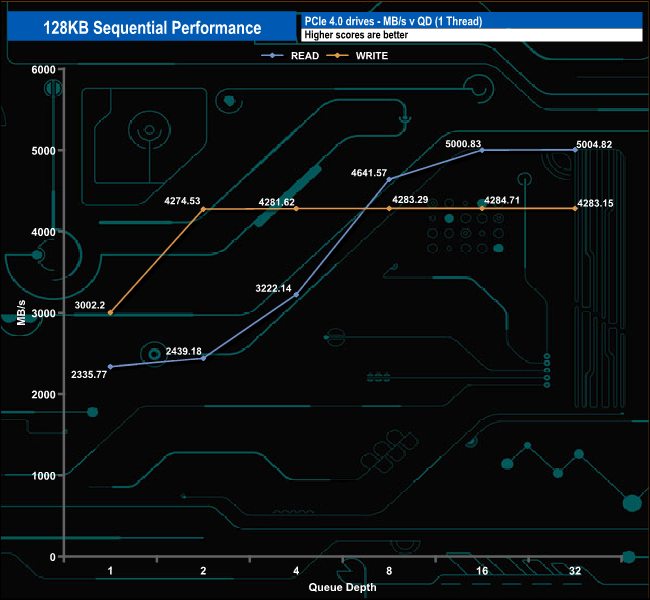 We used CrystalDiskMark 8‘s custom settings to test the Sequential read and write performance of the drive through a range of queue depths. The setup for the tests is listed below.
