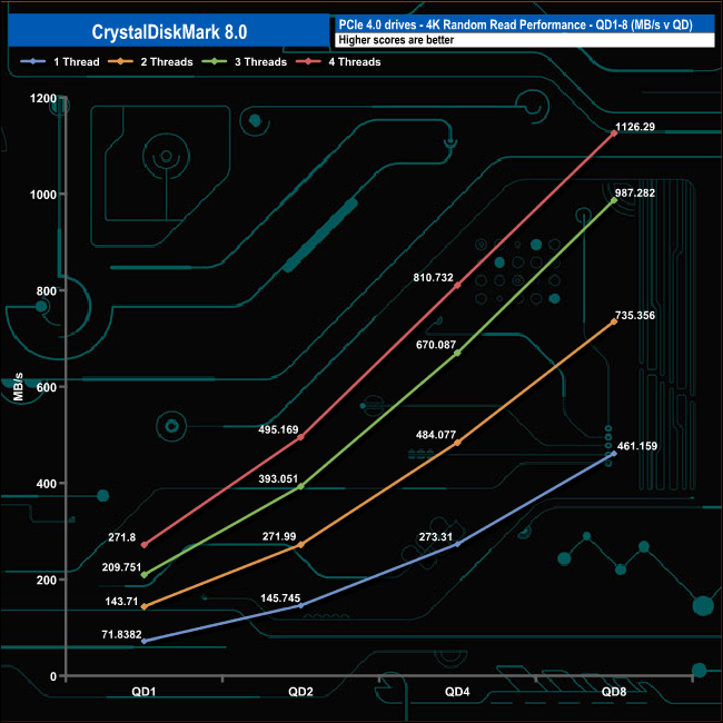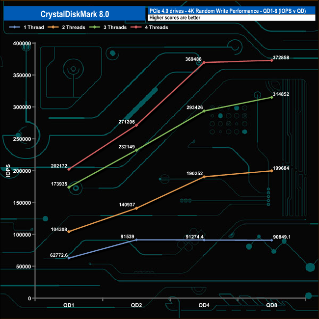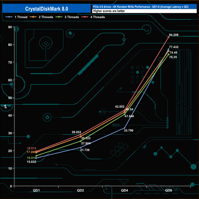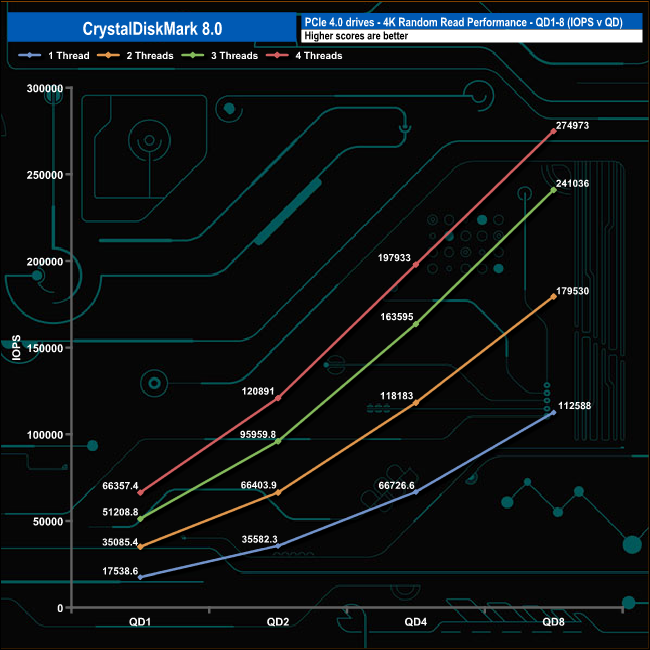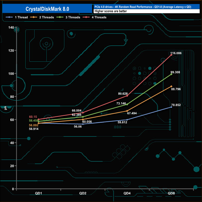 We used CrystalDiskMark 8 to test the random performance of the drive at lower queue depths (QD1 – QD8 where most of the everyday workloads occur) using 1 to 4 threads.