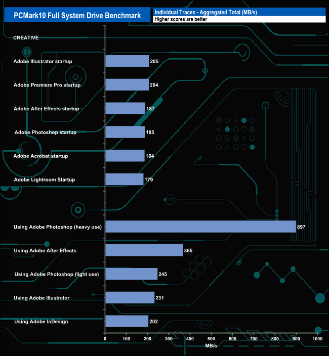 The PCMark 10 Full System Drive Benchmark uses a wide-ranging set of real-world traces from popular applications and common tasks to fully test the performance of the fastest modern drives. The benchmark is designed to measure the performance of fast system drives using the SATA bus at the low end and devices connected via PCI Express at the high end.