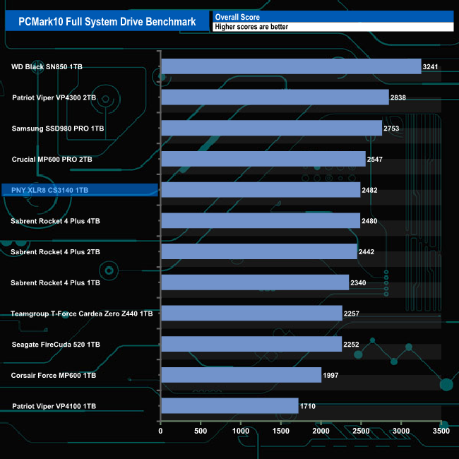 The PNY XLR8 CS3140 handled the PCMark10’s Full System Drive benchmark well with solid scores for all the test traces. The 897MB/s for the Heavy Use Adobe Photoshop trace is very good and also impressive was the 3,738MB/s the drive produced for the cp1 write test.