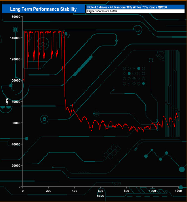 For the long term performance stability test, we set the drive up to run a 20-minute 4K random test with a 30% write, 70% read split, at a Queue Depth of 256 over the entire disk. The 1TB PNY XLR8 CS3140 averaged 80,974 IOPS for the test with a performance stability of 55%.