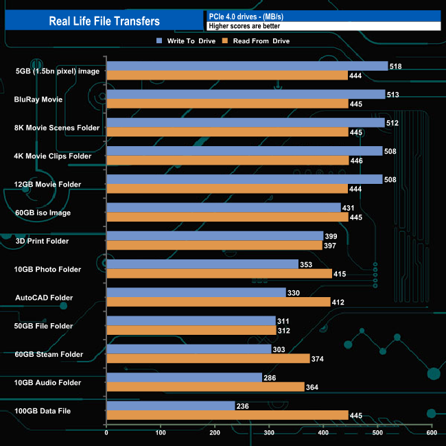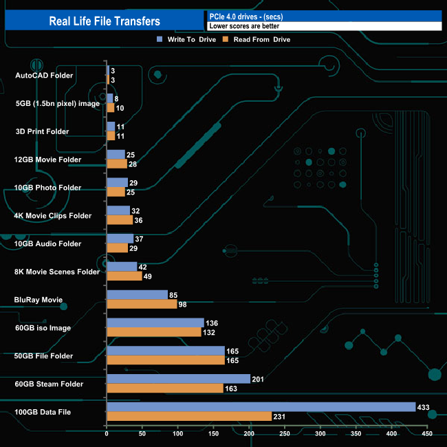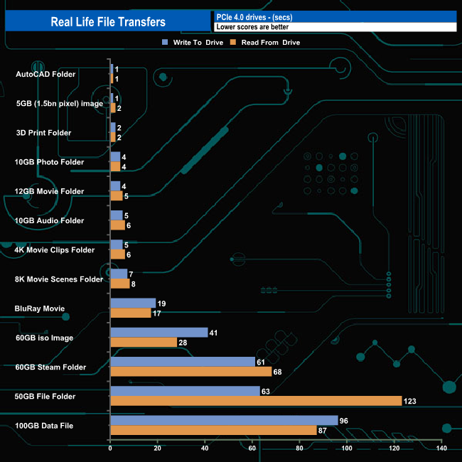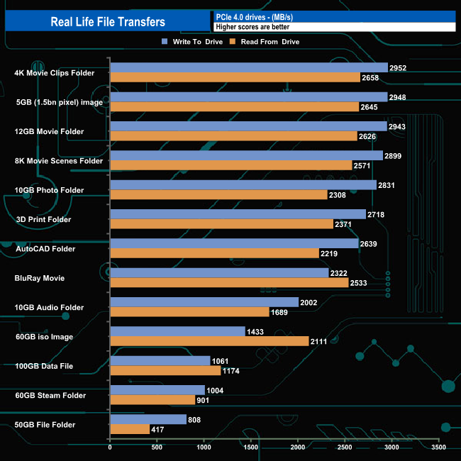 Switching over to an all NVMe storage environment we see write speeds approaching 3GB/s, the fastest being the 2,952MB/s when writing the contents of the 4K Movie clips folder. Nine of the thirteen transfers were over 2GB/s when it came to both reads and writes.