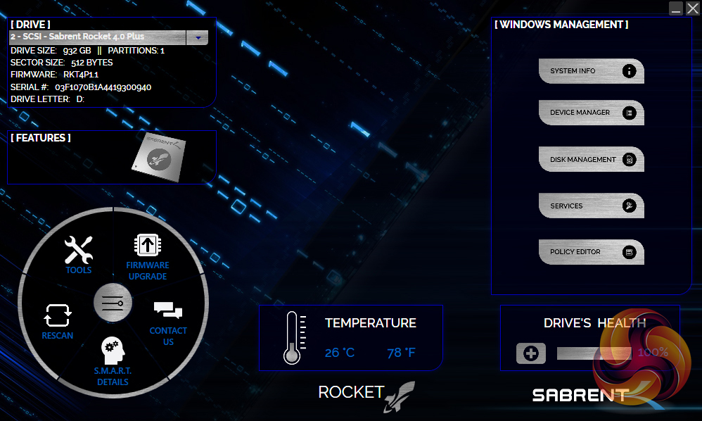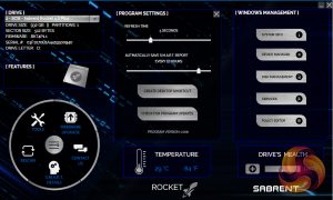 Sabrent's SSD management software goes by the name Rocket Control Panel. It has a fancy, easy to use GUI and it allows you to all the usual things like checking the drive's health and updating the firmware. It also has a link to download a copy of Acronis True Image for Sabrent.