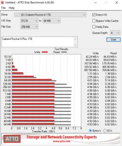 Sabrent rate the 1TB Rocket 4 Plus at up to 7,000MB/s for Sequential reads and while we couldn't quite match that maximum figure with the ATTO benchmark result of 6,820MB/s, but even so, that test result makes the drive the fastest Gen 4 drive we have seen to date. In a similar vein, we couldn't match the official maximum Sequential write rating of 5,300MB/s with a test result figure of 4,950MB/s, but once again it's the fastest we've seen to date for a Gen 4 drive.