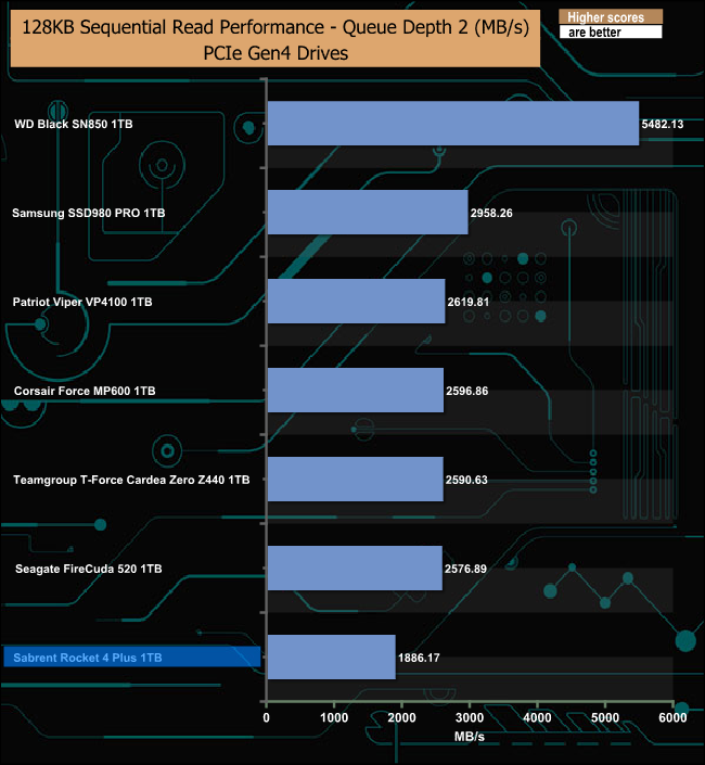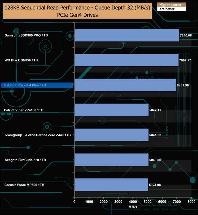 Compared to the other Gen 4 drives we've tested, the Sabrent Rocket 4 Plus sits at the bottom of our performance charts until the QD32 test where it steams up the chart to sit in third place behind the WD Black SN850 and the Samsung SSD980 PRO.