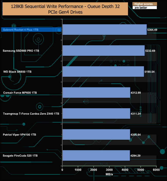Unlike the Sequential read performance, in the Sequential write tests, there wasn't a QD where the Rocket 4 Plus isn't the fastest drive we've seen to date.