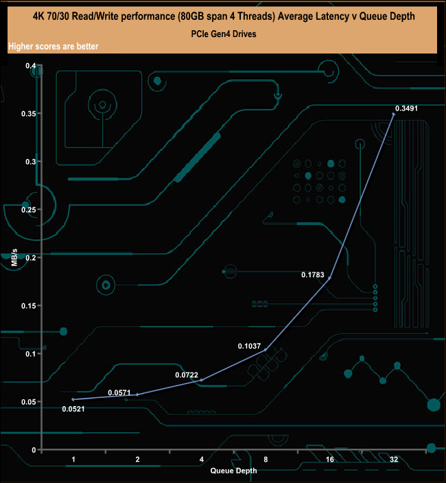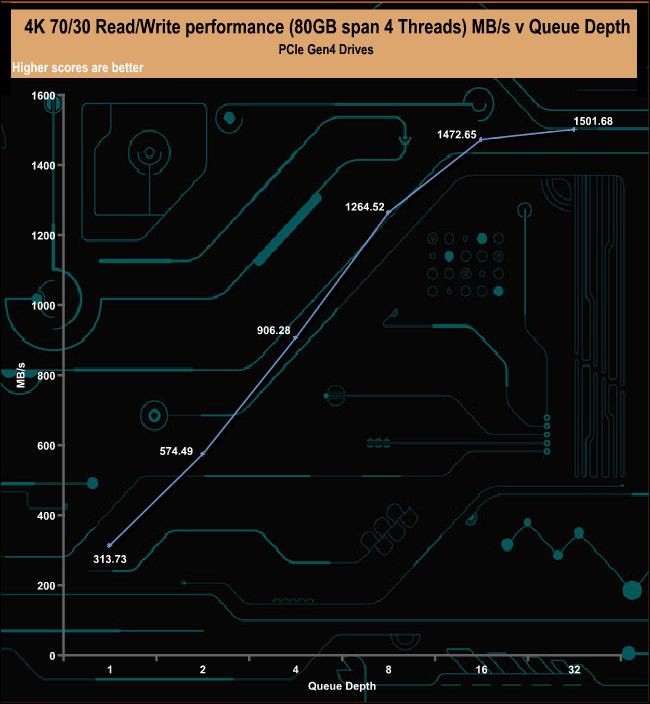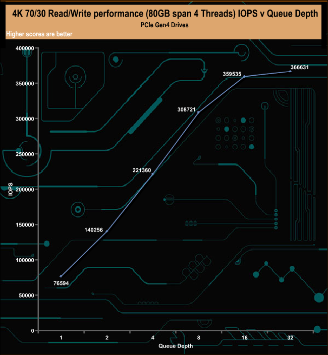 The 2TB Rocket 4 Plus handles our 4K 70/30, read/write mixed test very well, ending the test run (QD32) at 366,631 IOPS (1,501.68MB/s).