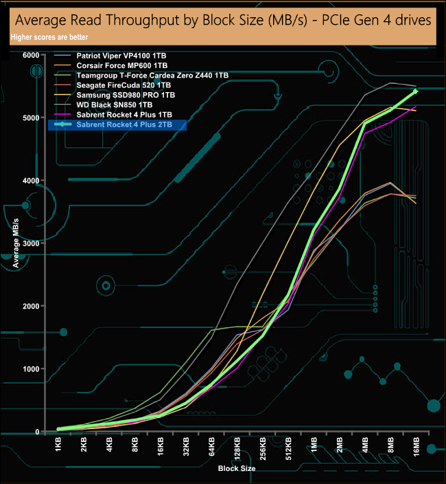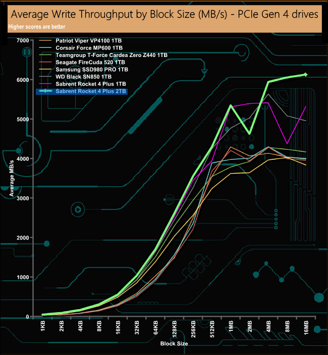In our read throughput test the 2TB Rocket 4 Plus peaked at 5,417MB/s (16MB block), putting it into second place behind WD’s Black SN850 drive.
