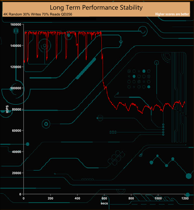 For the long term performance stability test, we set the drive up to run a 20-minute 4K random test with a 30% write, 70% read split, at a Queue Depth of 256 over the entire disk. The 2TB Sabrent Rocket 4 Plus averaged 115,934 IOPS for the test with a performance stability of 75.5% which is excellent for a consumer drive. Incediently those figures are a good deal better than the 83,504 IOPS average and 55% performance stability of the 1TB Rocket 4 Plus.