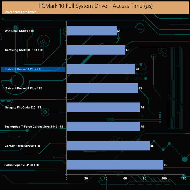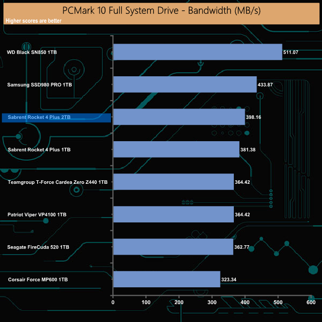 Overall in PCMark 10’s Full System Drive benchmark, the 2TB Rocket 4 Plus sits behind WD’s Black SN850 and Samsung SSD980 PRO. It is the fastest of the Phison powered drives we’ve tested to date.