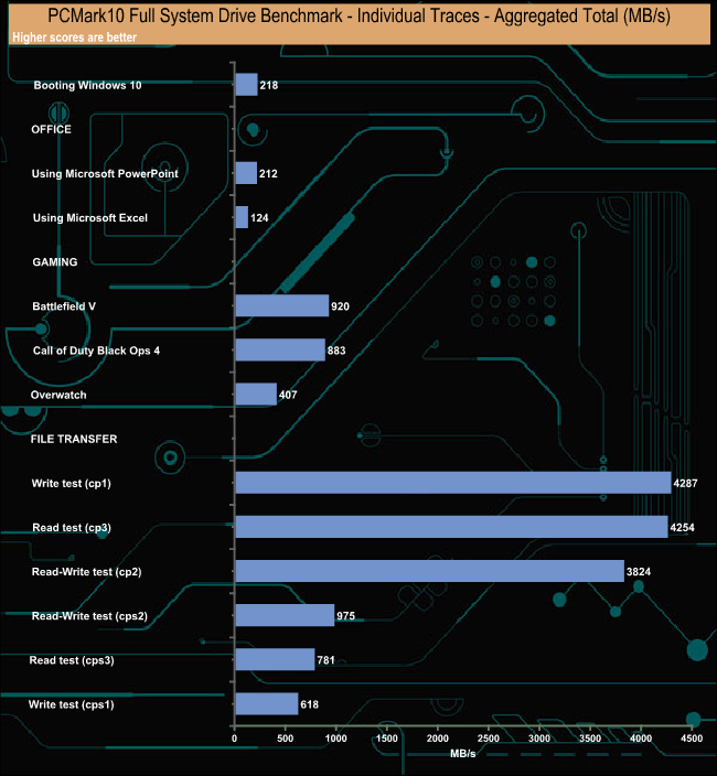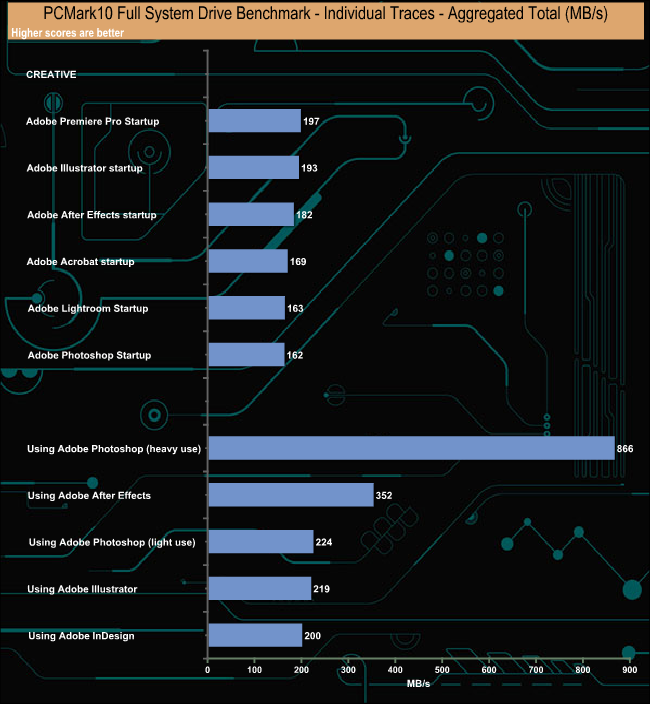 The PCMark 10 Full System Drive Benchmark uses a wide-ranging set of real-world traces from popular applications and common tasks to fully test the performance of the fastest modern drives. The benchmark is designed to measure the performance of fast system drives using the SATA bus at the low end and devices connected via PCI Express at the high end.
