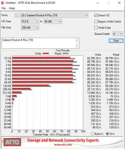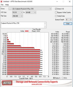 Officially the 2TB Sabrent Rocket 4 Plus is rated at up to 7,100MB/s for reads and 6,600MB/s for writes. Using the ATTO benchmark we couldn't quite reach those maximums but the 6,840MB/s read and 6,380MB/s write figures we did achieve are the fastest we have seen to date for a Gen 4 SSD.
