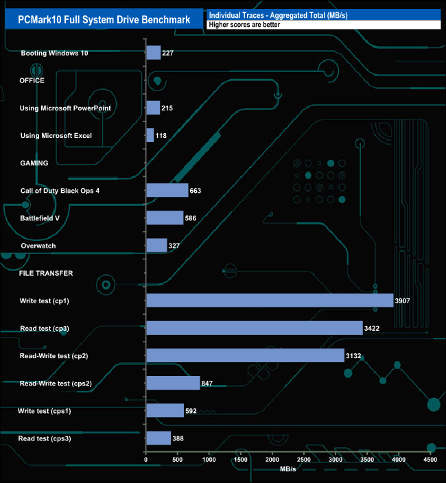 The PCMark 10 Full System Drive Benchmark uses a wide-ranging set of real-world traces from popular applications and common tasks to fully test the performance of the fastest modern drives. The benchmark is designed to measure performance of fast system drives using the SATA bus at the low end and devices connected via PCI Express at the high end.
