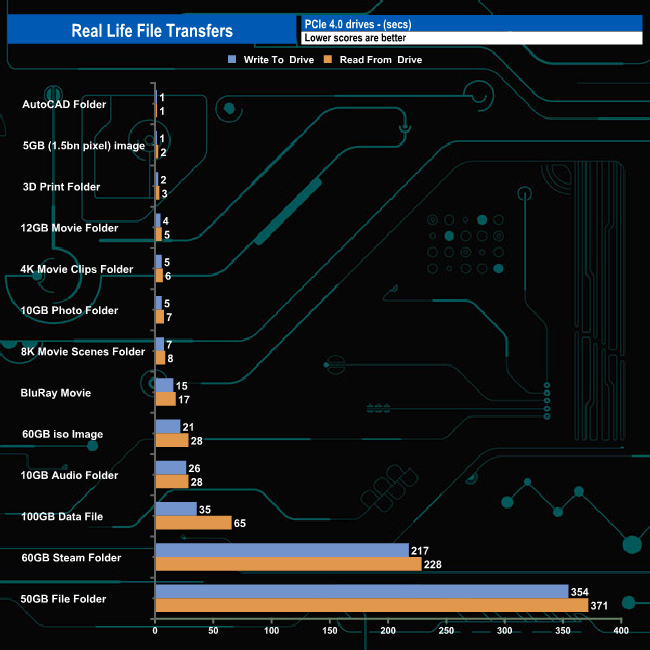 Switching over to the NVMe drive to transfer data to and from the 4TB Rocket 4 Plus saw transfer speeds for the large file transfers rocket and times taken drop dramatically. Seven of the transfers topped well over 2.5GB/s for writing to the drive with four just a shade under 3GB/s.