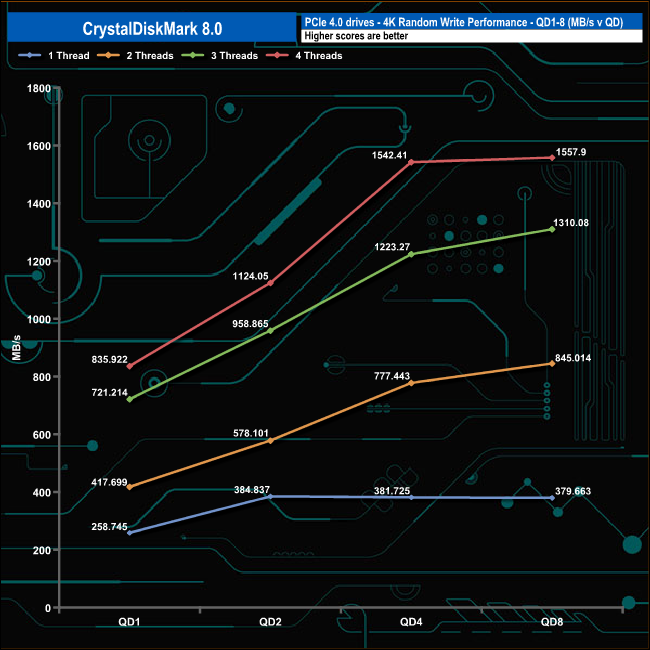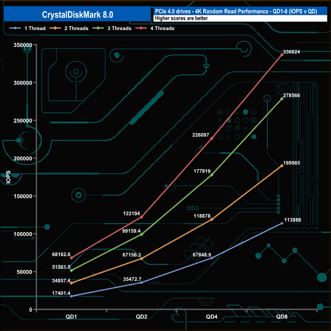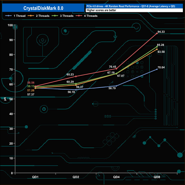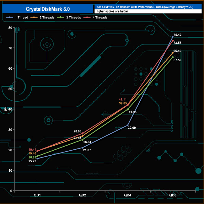 We also used CrystalDiskMark 8 to test the random performance of the drive at lower queue depths (QD1 – QD8 where most of the everyday workloads occur) using 1 to 4 threads.
