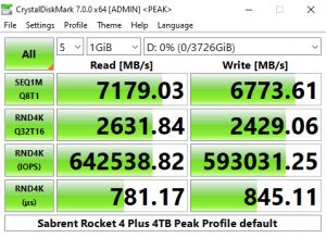 Looking at the results for the Peak Performance profile, we could confirm the official 7,200MB/s Sequential read performance figure with a best test result of 7,401MB/s, however, the best write figure we saw was 6,790MB/s, some way off the official 6,900MB/s.