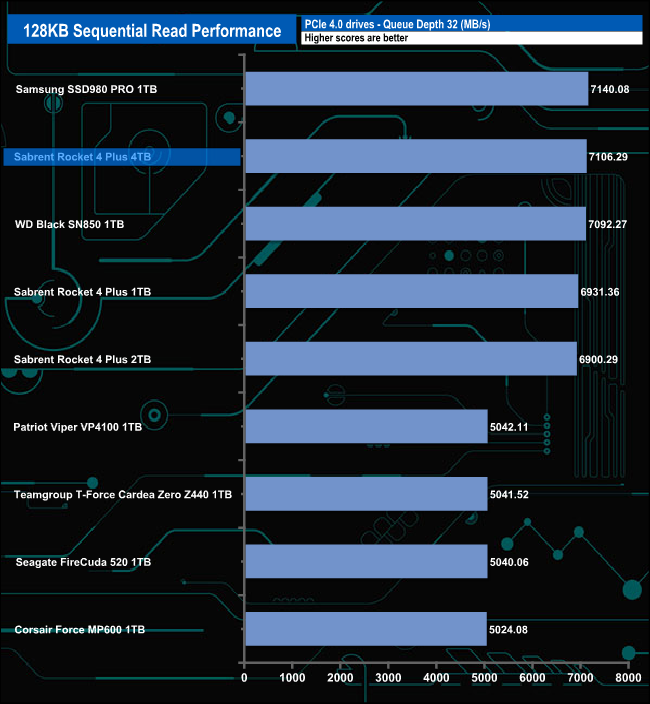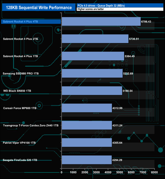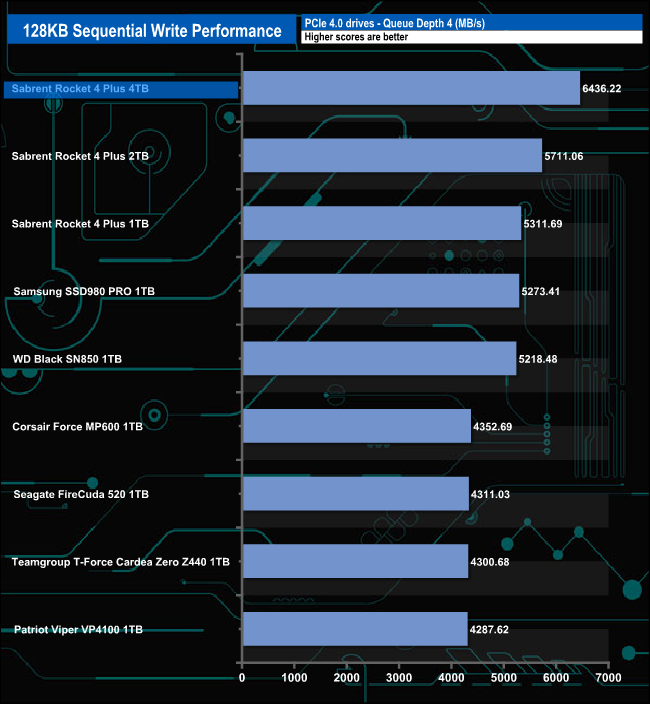 When it came to the Sequential write tests, the 2TB version of the drive was faster at QD1 but after that its the 4TB Rocket 4 Plus drive that rules the roost.