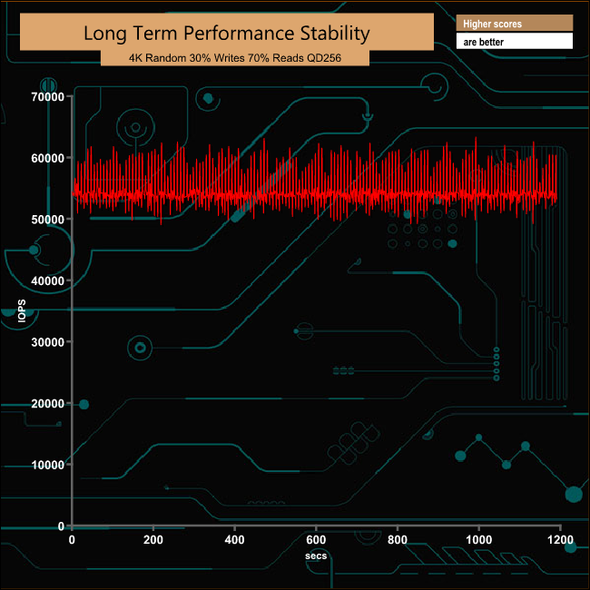 For the long term performance stability test, we set the drive up to run a 20-minute 4K random test with a 30% write, 70% read split, at a Queue Depth of 256 over the entire disk. The 4TB Samsung SSD 860 QVO averaged 54,415 IOPS for the test with an impressive performance stability of 88.8%.
