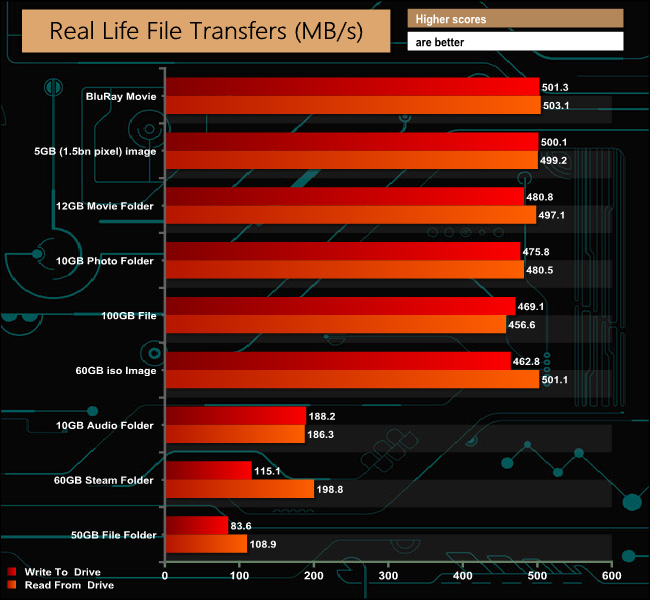 The drive had no real problems in our real life file transfer tests, although it handled larger file sizes much more efficiently than the small files contained in the 60GB Steam, 50GB File and 10GB audio folders.