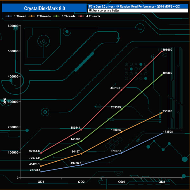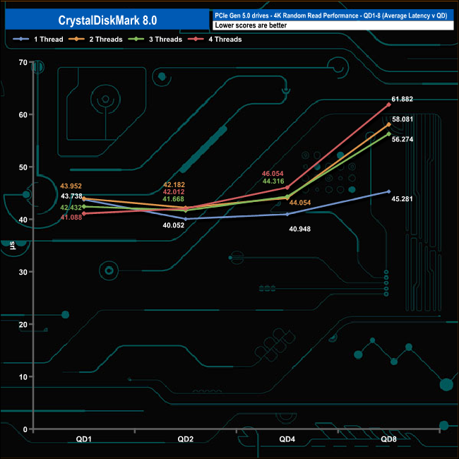 We used CrystalDiskMark 8 to test the random performance of the drive at lower queue depths (QD1 – QD8 where most of the everyday workloads occur) using 1 to 4 threads.