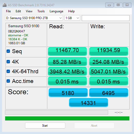 In the AS-SSD benchmark test, the 9100 Pro read score of 5180 puts the drive into third place in the results table behind both versions of the Biwin Black Opal X570 Pro we've recently tested.