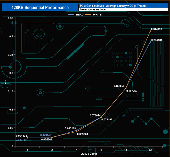We used CrystalDiskMark 8‘s custom settings to test the Sequential read and write performance of the drive through a range of queue depths. The setup for the tests is listed below.