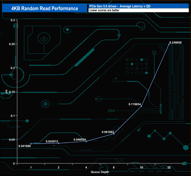 We used CrystalDiskMark 8‘s custom settings to test the 4K random read performance of the drive through a range of queue depths. The setup for the tests is listed below.