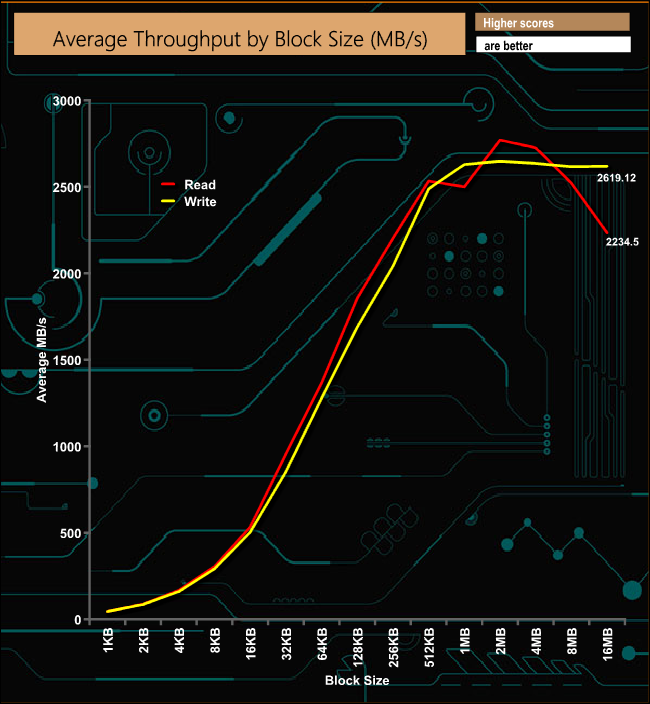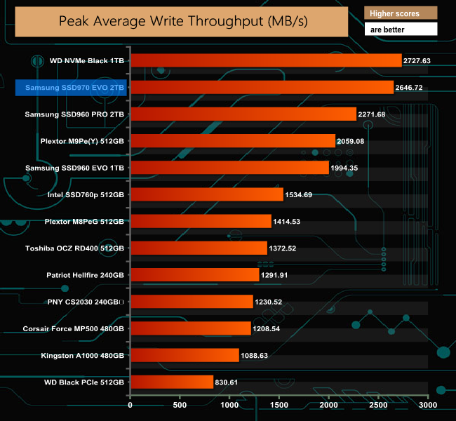 In our throughput tests, the Samsung 970 EVO is the second fastest drive we have tested to date, sitting just below WD's Black NVMe drive.