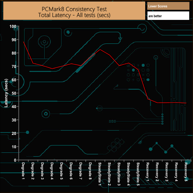 Futuremark’s PCMark 8 is a very good all round system benchmark but it’s Storage Consistency Test takes it to whole new level when testing SSD drives. It runs through four phases; Preconditioning, Degradation, Steady State, Recovery and finally Clean Up. During the Degradation, Steady State and Recovery phases it runs performance tests using the 10 software programs that form the backbone of PCMark 8; Adobe After Effects, Illustrator, InDesign, Photoshop Heavy and Photoshop Light, Microsoft Excel, PowerPoint, Word, Battlefield 3 and World of Warcraft. With some 18 phases of testing, this test can take many hours to run.