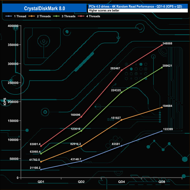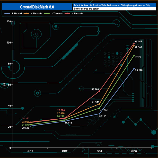 We used CrystalDiskMark 8 to test the random performance of the drive at lower queue depths (QD1 – QD8 where most of the everyday workloads occur) using 1 to 4 threads.
