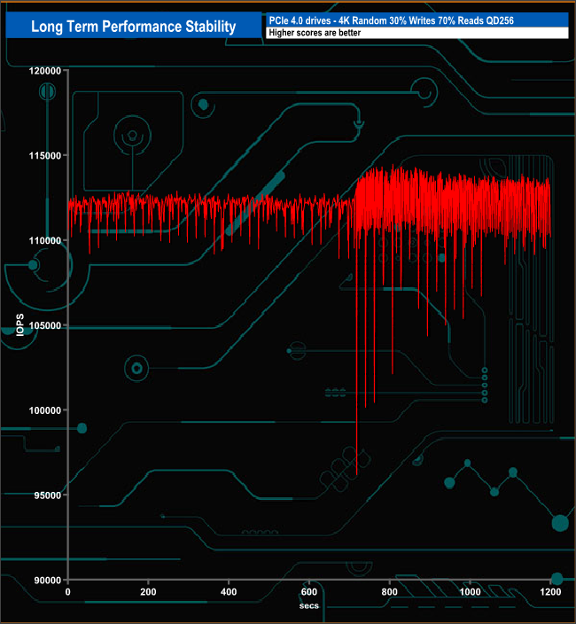 For the long term performance stability test, we set the drive up to run a 20-minute 4K random test with a 30% write, 70% read split, at a Queue Depth of 256 over the entire disk. The 1TB Samsung 980 Pro Heatsink averaged 112,146 IOPS for the test with an excellent performance stability of 98%.