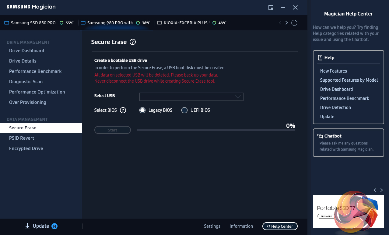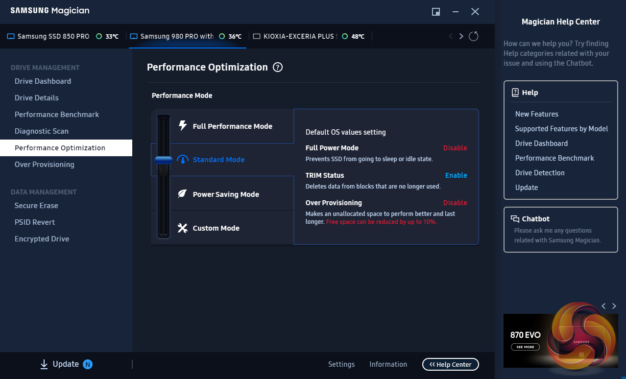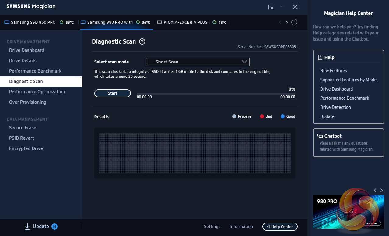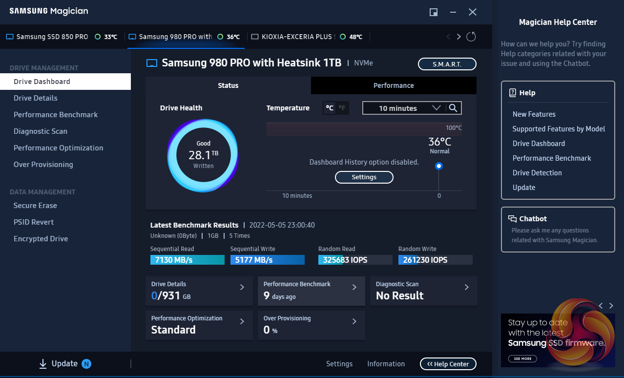 Samsung’s SSD management utility goes by the name of Magician and can be downloaded from Samsung’s website. We used version v7.0.1 with the SSD 980 Pro Heatsink. The software is constantly updated and graphically refreshed and it has come a long way in usability since its first versions.