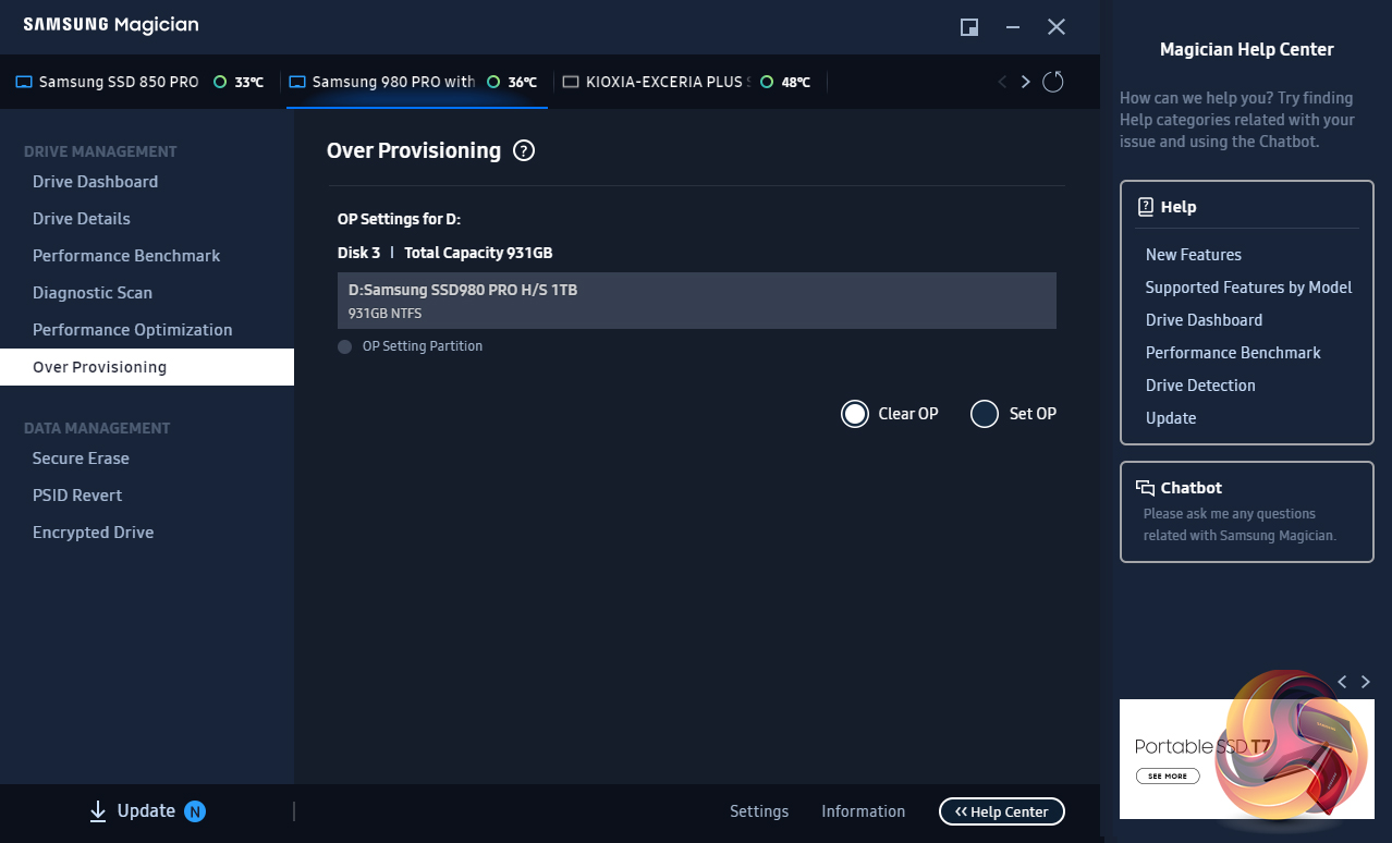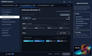 Magician allows you to do most maintenance jobs you may need to do with an SSD; updating firmware, optimise performance, adjust the Over Provisioning, enabling data security (the drive supports AES 256-bit full-disk encryption, TCG/Opal V2.0, and Encrypted Drive -IEEE1667 (MS eDrive ) ) and securely erase the drive. Magician also features a built-in benchmark tool.