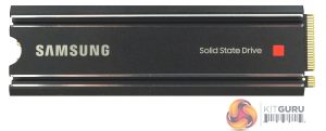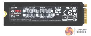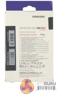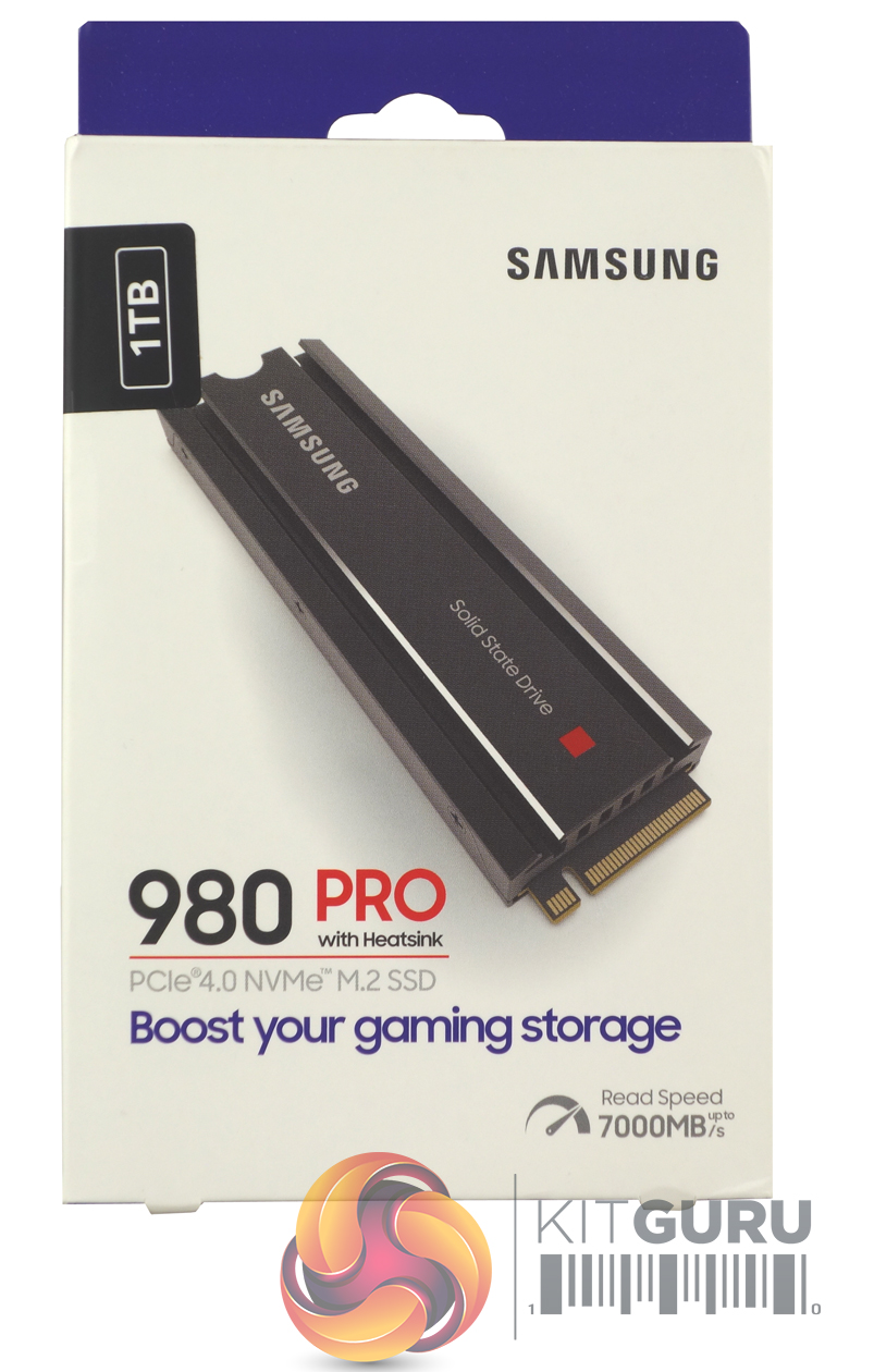 The Samsung 980 Pro with Heatsink comes in a stout box with an image of the drive on the front, above which is a sticker showing the drive's capacity. Under the image, there is a note of the drive's maximum sequential read speed – 7,000MB/s.