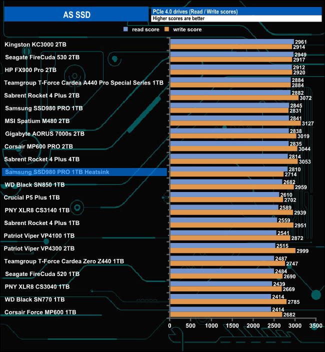 The read and write scores of 2810 and 2714 from the 980 Pro Heatsink version are lower than the scores from the standard 980 Pro. The Heatsink-equipped drive has different firmware installed than the standard model which may account for the lower scores of the later drive.