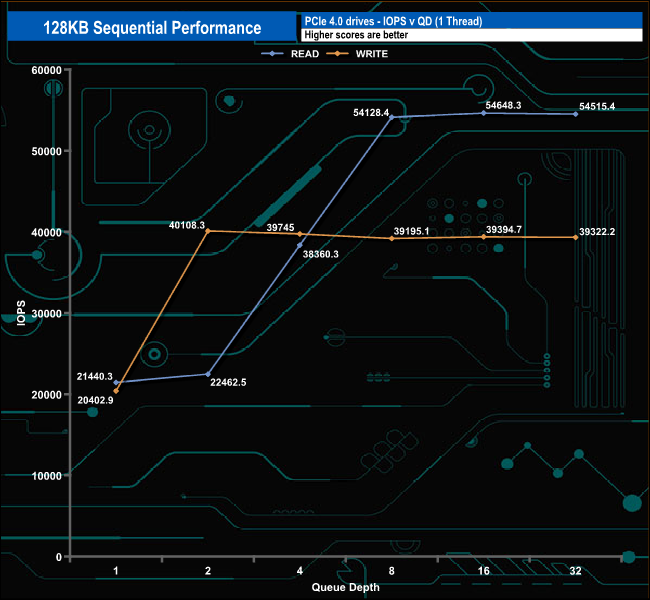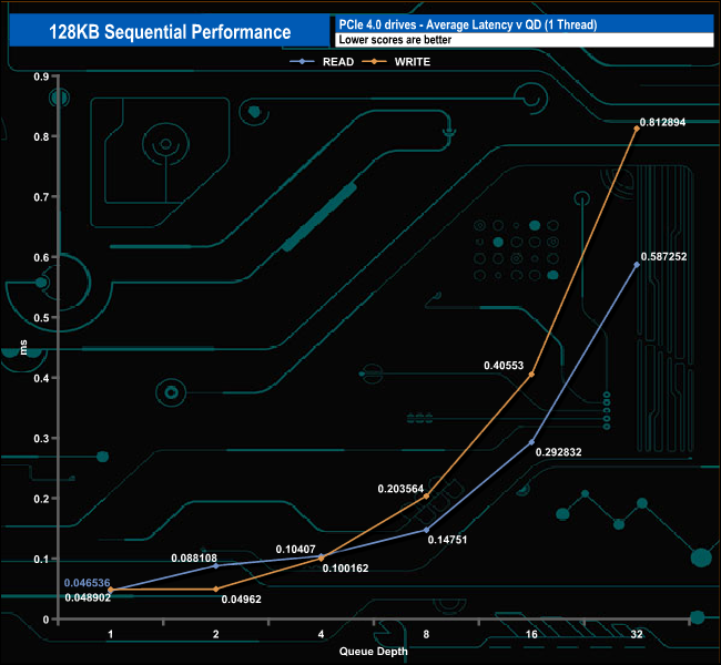 We used CrystalDiskMark 8‘s custom settings to test the Sequential read and write performance of the drive through a range of queue depths. The setup for the tests is listed below.