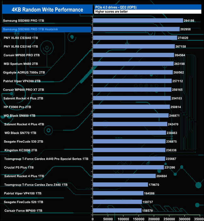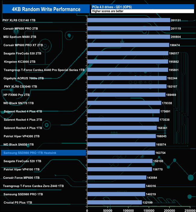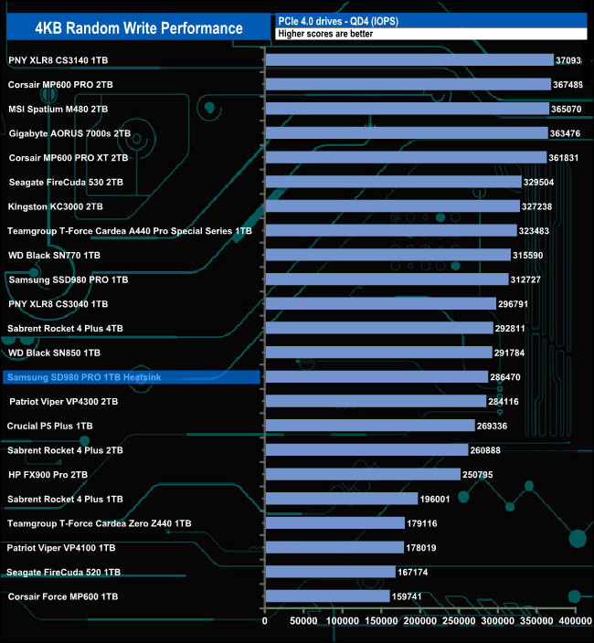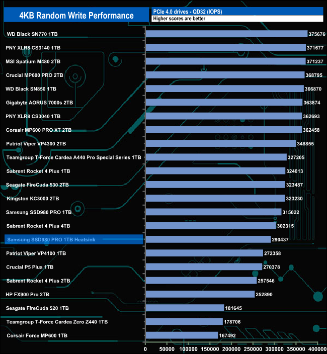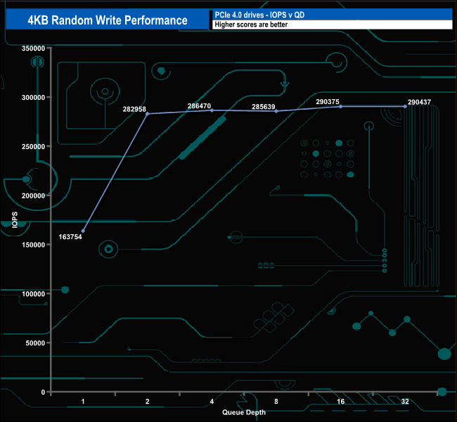 As with the random read performance, the best write performance figure we saw was 290,437 IOPS was nowhere near the official maximum of 1,000,000 IOPS.
