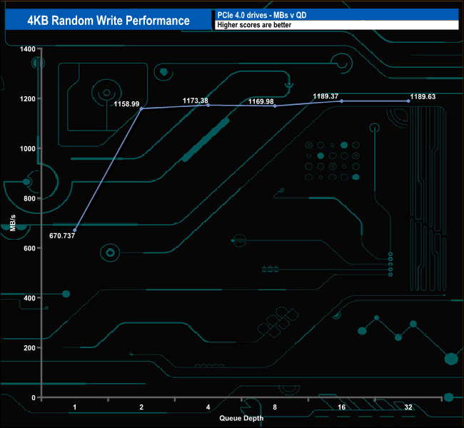 We used CrystalDiskMark 8‘s custom settings to test the 4K random write performance of the drive through a range of queue depths. The setup for the tests is listed below.