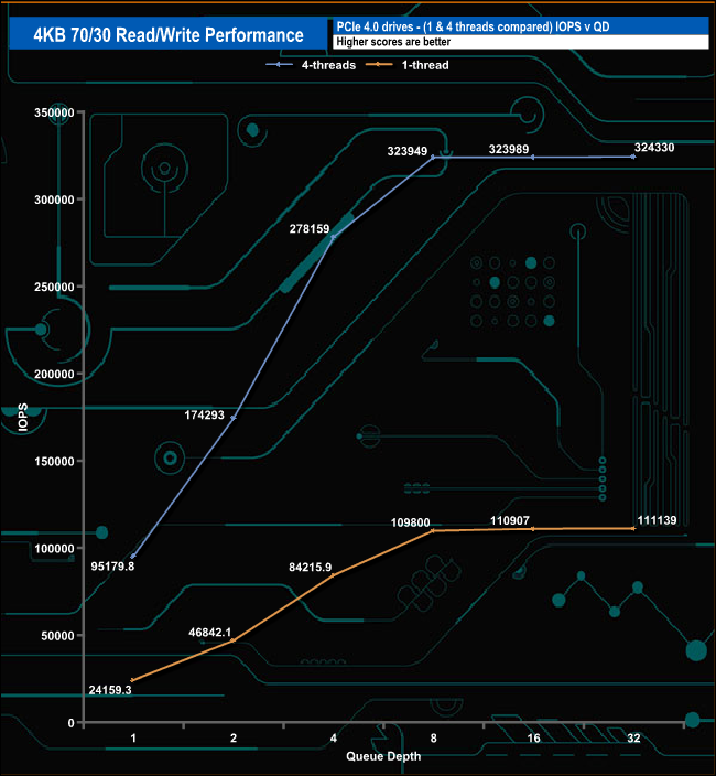 We used CrystalDiskMark 8’s custom settings to test the 4K 70/30 mixed read/write performance of the drive through a range of queue depths using a single thread and four threads.
