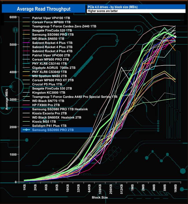 In our read-throughput test the drive peaked at the 8MB block mark at 5,443MB/s, quite some way short of the official maximum of 7,450MB/s. However, it was 180MB/s faster than the heatsink version of the previous generation SSD 980 Pro and 283MB/s faster than the standard SSD 980 Pro.