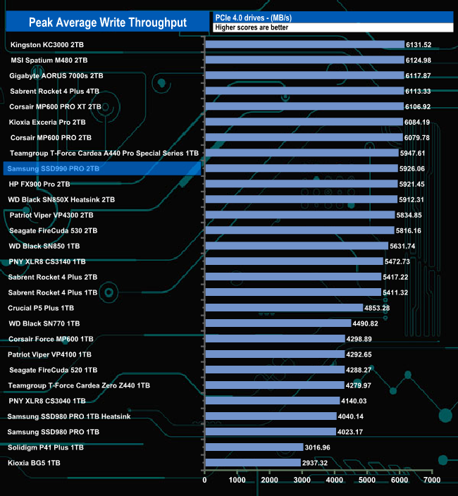 In the write throughput test, the drive peaked at the end of the test with a result of 5,926MB/s. Once again slower than the official maximum but a lot faster than the two models of the previous generation SSD 980 Pro; 1,886MB/s in the case of the heatsink-equipped drive and 1,903MB/s for the standard one.