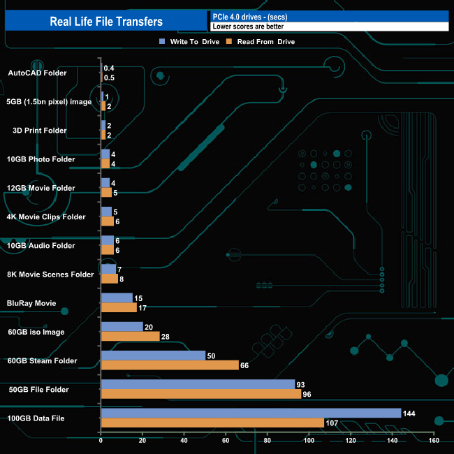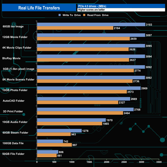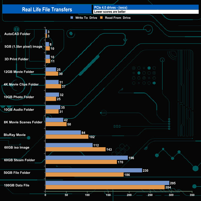 Writing to and reading from an NVMe drive saw transfer speeds rocket and overall transfer times dropped dramatically. six of the transfers topped over 3GB/s when writing to the drive. Of the remaining seven tests, three topped 2.5GB/s and two topped 1GB/s when writing to the disk. The drive did seem to have a bit of a struggle when reading the 100GB data file, however.