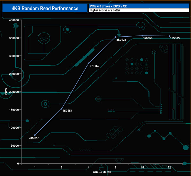 Using our 4-threaded random read 4K tests we couldn't get close to the official maximum at QD32 of 1,550,000 IOPS. The best figure we saw was 356,356 IOPS at QD16.