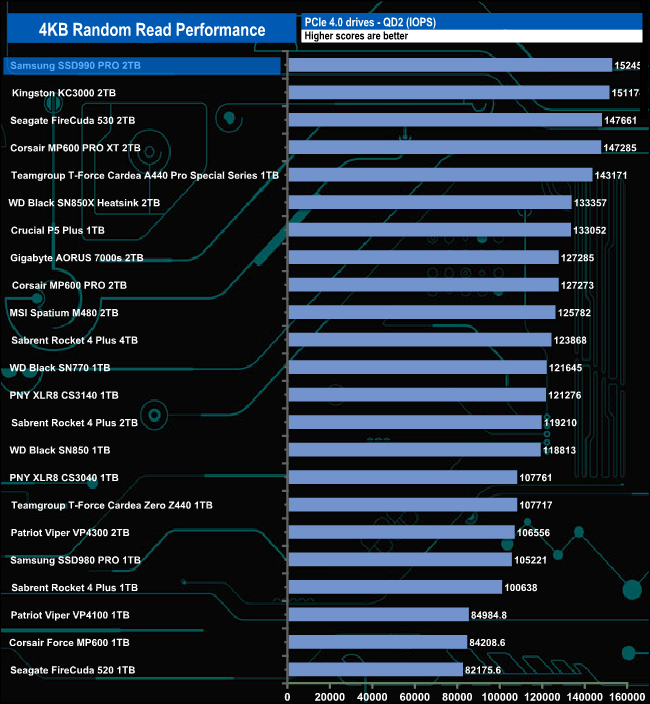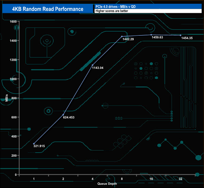 We used CrystalDiskMark 8‘s custom settings to test the 4K random read performance of the drive through a range of queue depths. The setup for the tests is listed below.