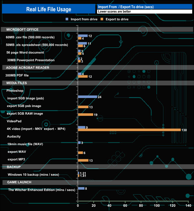 We also timed moving a Win 10 backup file to and from the drive and launching a game from the T9.