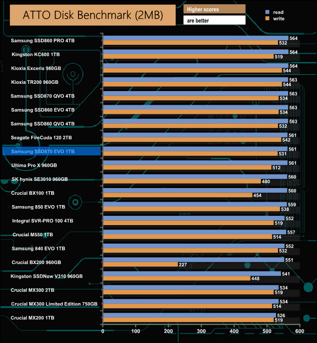 The official Sequential ratings for the SSD 870 EVO are up to 560MB/s for reads and up to 530MB/s for writes, which is par for the course with a modern SATA 6Gb/s drive. Testing with the ATTO benchmark confirmed these figures, with the drive producing a read figure of 561MB/s with writes at 531MB/s.