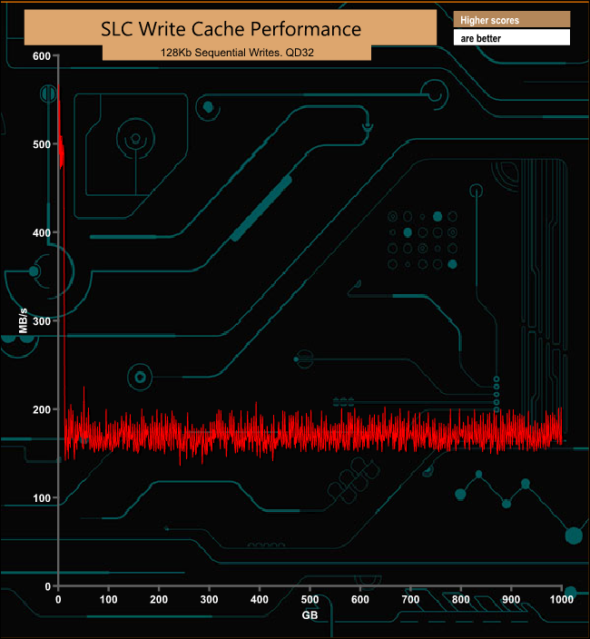 The SSD 870 QVO uses Samsung’s Intelligent TurboWrite technology to boost write speeds by using a portion of the NAND to run in SLC mode as a write buffer. By default the fixed part of this buffer is 6GB but if more is needed the technology allows for, in the case of the 4TB drive, an extra 72GB Intelligent TurboWrite region. The official Sequential write performance figure for the default buffer is up to 530MB/s but out of the buffer, this figure drops to 160MB/s. In our cache test, the performance in the default 6GB buffer averaged 486.92MB/s and 169.45MB/s out of the buffer.